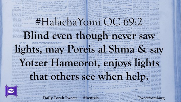#HalachaYomi OC 69:2 Blind even though never saw lights, may Poreis al Shma & say Yotzer Hameorot, enjoys lights that others see when help.