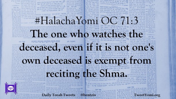 #HalachaYomi OC 71:3 The one who watches the deceased, even if it is not one’s own deceased is exempt from reciting the Shma.
