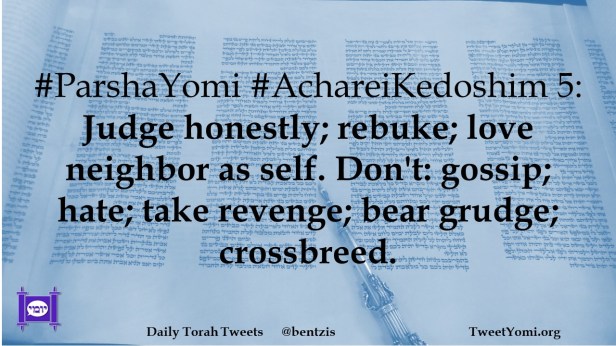 #ParshaYomi #AchareiKedoshim 5: Judge honestly; rebuke; love neighbor as self. Don’t: gossip; hate; take revenge; bear grudge; crossbreed.
