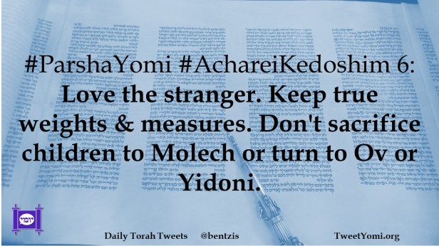 #ParshaYomi #AchareiKedoshim 6: Love the stranger. Keep true weights & measures. Don’t sacrifice children to Molech or turn to Ov or Yidoni.