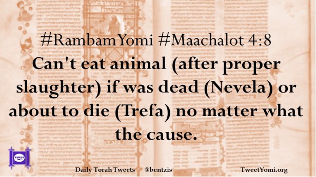 #RambamYomi #Maachalot 4:8 Can’t eat animal (after proper slaughter) if was dead (Nevela) or about to die (Trefa) no matter what the cause.