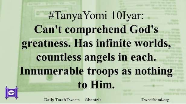 #TanyaYomi 10Iyar: Can’t comprehend God’s greatness. Has infinite worlds, countless angels in each. Innumerable troops as nothing to Him.