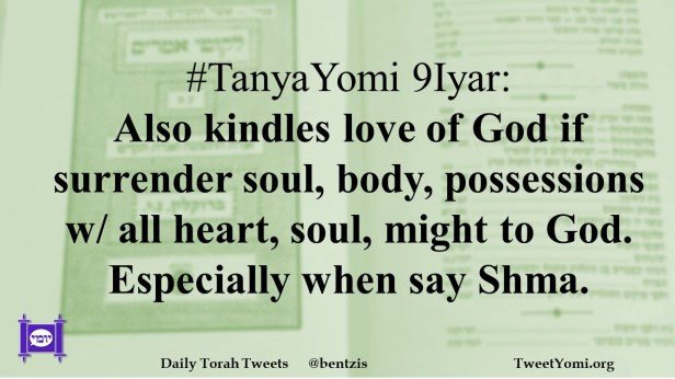 #TanyaYomi 9Iyar: Also kindles love of God if surrender soul, body, possessions w/ all heart, soul, might to God. Especially when say Shma.