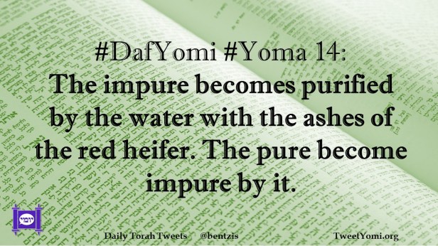 DafYomi, Yoma #DafYomi #Yoma 14 Date: July 20, 2021Author: ysspitz #DafYomi #Yoma 14: The impure becomes purified by the water with the ashes of the red heifer. The pure become impure by it. Share this: Share on X (Opens in new window) X Share on Facebook (Opens in new window) Facebook Like Loading... Related