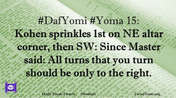 DafYomi, Yoma #DafYomi #Yoma 15 Date: July 20, 2021Author: ysspitz #DafYomi #Yoma 15: Kohen sprinkles 1st on NE altar corner, then SW: Since Master said: All turns that you turn should be only to the right. Share this: Share on X (Opens in new window) X Share on Facebook (Opens in new window) Facebook Like Loading... Related