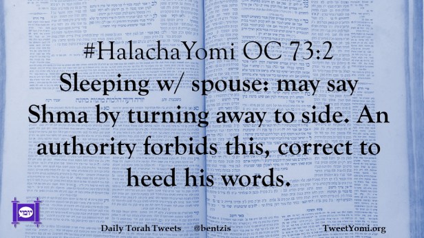 #HalachaYomi OC 73:2 Sleeping w/ spouse: may say Shma by turning away to side. An authority forbids this, correct to heed his words.