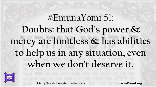 #EmunaYomi 51: Doubts: that God’s power & mercy are limitless & has abilities to help us in any situation, even when we don’t deserve it.