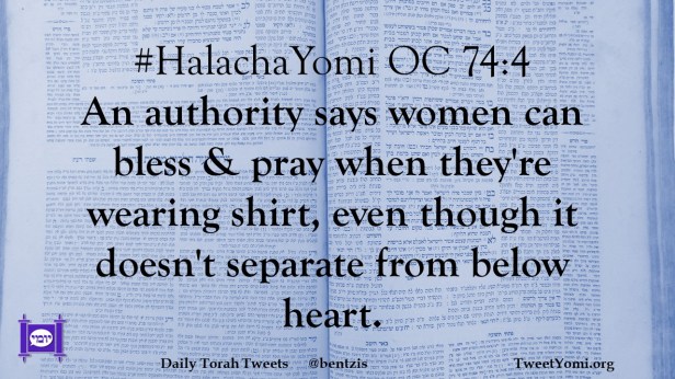#HalachaYomi OC 74:4 An authority says women can bless & pray when they’re wearing shirt, even though it doesn’t separate from below heart.