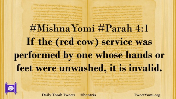 MishnaYomi, Parah #MishnaYomi #Parah 4:1 Date: July 21, 2021Author: ysspitz #MishnaYomi #Parah 4:1 If the (Chatat cow) service was performed by one whose hands or feet were unwashed, it is invalid. Share this: Share on X (Opens in new window) X Share on Facebook (Opens in new window) Facebook Like Loading... Related