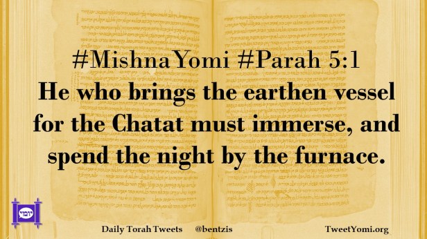 MishnaYomi, Parah #MishnaYomi #Parah 5:1 Date: July 22, 2021Author: ysspitz #MishnaYomi #Parah 5:1 He who brings the earthen vessel for the Chatat must immerse, and spend the night by the furnace. Share this: Share on X (Opens in new window) X Share on Facebook (Opens in new window) Facebook Like Loading... Related
