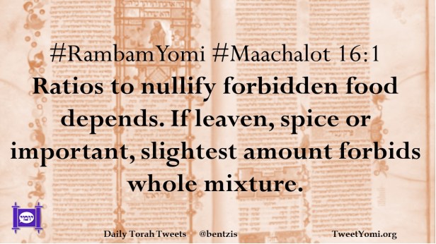 #RambamYomi #Maachalot 16:1 Ratios to nullify forbidden food depends. If leaven, spice or important, slightest amount forbids whole mixture.