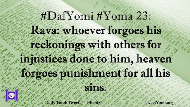 DafYomi, Yoma #DafYomi #Yoma 23 Date: July 23, 2021Author: ysspitz #DafYomi #Yoma 23: Rava: whoever forgoes his reckonings with others for injustices done to him, heaven forgoes punishment for all his sins. Share this: Share on X (Opens in new window) X Share on Facebook (Opens in new window) Facebook Like Loading... Related