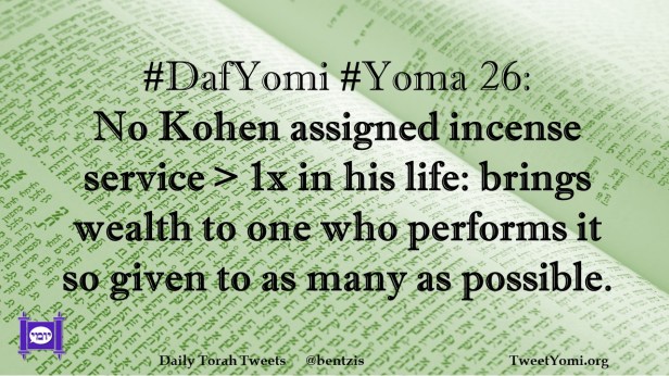 DafYomi, Yoma #DafYomi #Yoma 26 Date: July 23, 2021Author: ysspitz #DafYomi #Yoma 26: No Kohen assigned incense service > 1x in his life: brings wealth to one who performs it so given to as many as possible. Share this: Share on X (Opens in new window) X Share on Facebook (Opens in new window) Facebook Like Loading... Related