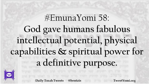#EmunaYomi 58: God gave humans fabulous intellectual potential, physical capabilities & spiritual power for a definitive purpose.