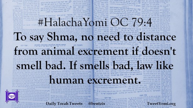 #HalachaYomi OC 79:4 To say Shma, no need to distance from animal excrement if doesn’t smell bad. If smells bad, law like human excrement.