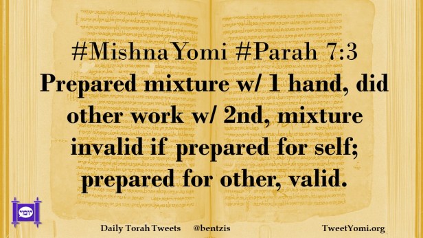 #MishnaYomi #Parah 7:3 Prepared mixture w/ 1 hand, did other work w/ 2nd, mixture invalid if prepared for self; prepared for other, valid.