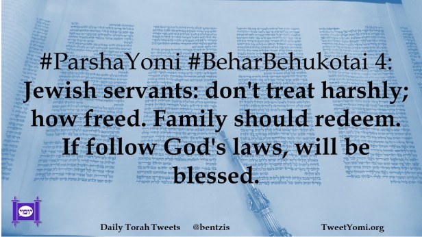 #ParshaYomi #BeharBehukotai 4: Jewish servants: don’t treat harshly; how freed. Family should redeem. If follow God’s laws, will be blessed.