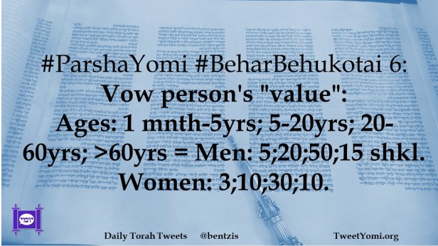 #ParshaYomi #BeharBehukotai 6: Vow person’s “value”: Ages: 1 mnth-5yrs; 5-20yrs; 20-60yrs; >60yrs = Men: 5;20;50;15 shkl. Women: 3;10;30;10.