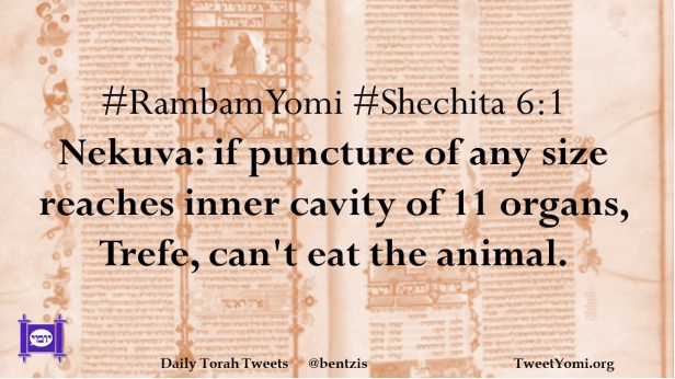 RambamYomi, Shechita #RambamYomi #Shechita 6:1 Date: July 23, 2021Author: ysspitz #RambamYomi #Shechita 6:1 Nekuva: if puncture of any size reaches inner cavity of 11 organs, Trefe, can’t eat the animal. Share this: Share on X (Opens in new window) X Share on Facebook (Opens in new window) Facebook Like Loading... Related