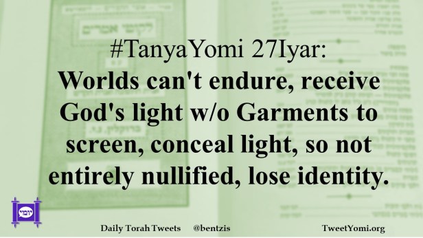 #TanyaYomi 27Iyar: Worlds can’t endure, receive God’s light w/o Garments to screen, conceal light, so not entirely nullified, lose identity.