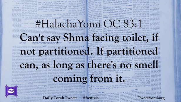 #HalachaYomi OC 83:1 Can’t say Shma facing toilet, if not partitioned. If partitioned can, as long as there’s no smell coming from it.