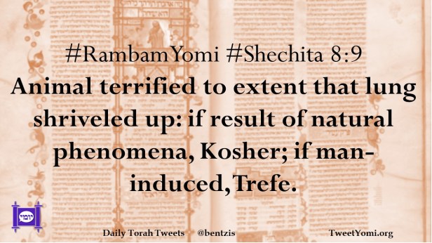 #RambamYomi #Shechita 8:9 Animal terrified to extent that lung shriveled up: if result of natural phenomena, Kosher; if man-induced, Trefe.