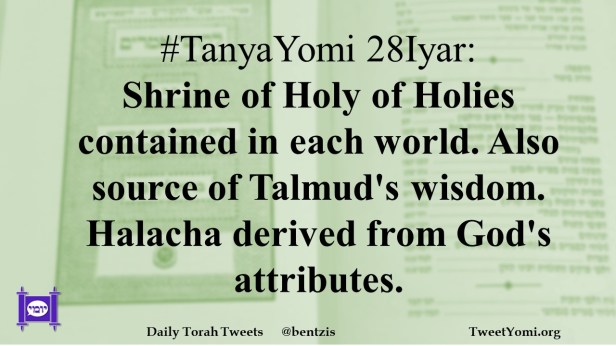 #TanyaYomi 28Iyar: Shrine of Holy of Holies contained in each world. Also source of Talmud’s wisdom. Halacha derived from God’s attributes.