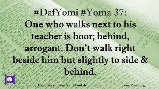 DafYomi, Yoma #DafYomi #Yoma 37 Date: July 30, 2021Author: ysspitz #DafYomi #Yoma 37: One who walks next to his teacher is boor; behind, arrogant. Don’t walk right beside him but slightly to side & behind. Share this: Share on X (Opens in new window) X Share on Facebook (Opens in new window) Facebook Like Loading... Related
