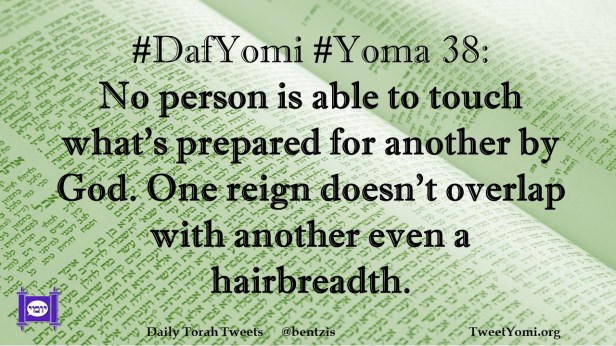 DafYomi, Yoma #DafYomi #Yoma 38 Date: July 30, 2021Author: ysspitz #DafYomi #Yoma 38: No person is able to touch what’s prepared for another by God. One reign doesn’t overlap with another even a hairbreadth. Share this: Share on X (Opens in new window) X Share on Facebook (Opens in new window) Facebook Like Loading... Related