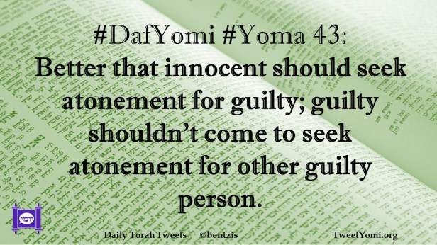 DafYomi, Yoma #DafYomi #Yoma 43 Date: July 30, 2021Author: ysspitz #DafYomi #Yoma 43: Better that innocent should seek atonement for guilty; guilty shouldn’t come to seek atonement for other guilty person. Share this: Share on X (Opens in new window) X Share on Facebook (Opens in new window) Facebook Like Loading... Related