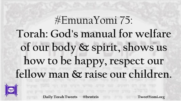 #EmunaYomi 75: Torah: God’s manual for welfare of our body & spirit, shows us how to be happy, respect our fellow man & raise our children.