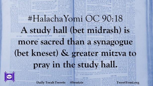 #HalachaYomi OC 90:18 A study hall (bet midrash) is more sacred than a synagogue (bet kneset) & greater mitzva to pray in the study hall.