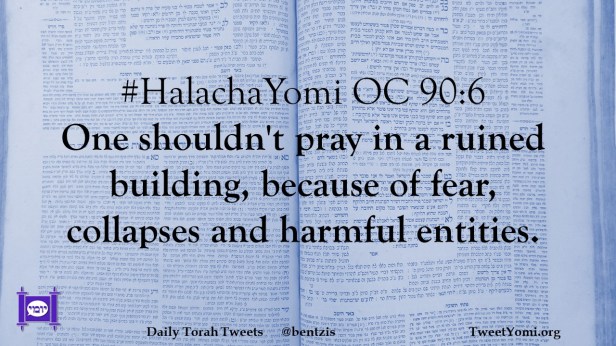 HalachaYomi #HalachaYomi OC 90:6 Date: July 30, 2021Author: ysspitz #HalachaYomi OC 90:6 One shouldn’t pray in a ruined building, because of fear, collapses and harmful entities. Share this: Share on X (Opens in new window) X Share on Facebook (Opens in new window) Facebook Like Loading... Related