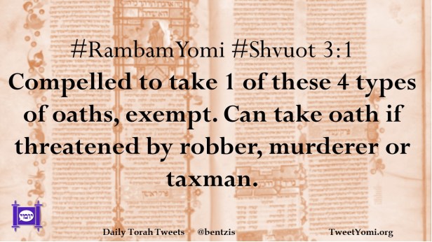 #RambamYomi #Shvuot 3:1 Compelled to take 1 of these 4 types of oaths, exempt. Can take oath if threatened by robber, murderer or taxman.