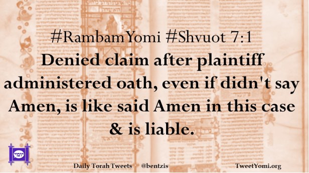 #RambamYomi #Shvuot 7:1 Denied claim after plaintiff administered oath, even if didn’t say Amen, is like said Amen in this case & is liable.