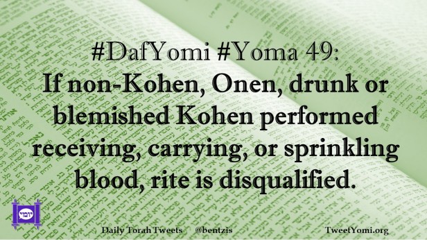 DafYomi, Yoma #DafYomi #Yoma 49 Date: August 1, 2021Author: ysspitz #DafYomi #Yoma 49: If non-Kohen, Onen, drunk or blemished Kohen performed receiving, carrying, or sprinkling blood, rite is disqualified. Share this: Share on X (Opens in new window) X Share on Facebook (Opens in new window) Facebook Like Loading... Related