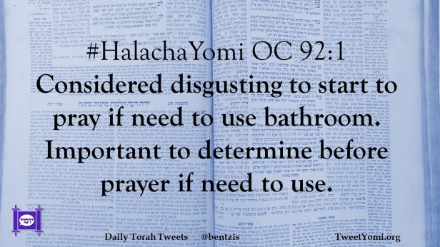 #HalachaYomi OC 92:1 Considered disgusting to start to pray if need to use bathroom. Important to determine before prayer if need to use.