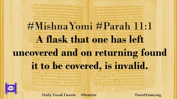 MishnaYomi, Parah #MishnaYomi #Parah 11:1 Date: August 1, 2021Author: ysspitz #MishnaYomi #Parah 11:1 A flask that one has left uncovered and on returning found it to be covered, is invalid. Share this: Share on X (Opens in new window) X Share on Facebook (Opens in new window) Facebook Like Loading... Related