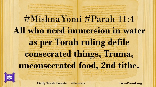#MishnaYomi #Parah 11:4 All who need immersion in water as per Torah ruling defile consecrated things, Truma, unconsecrated food, 2nd tithe.
