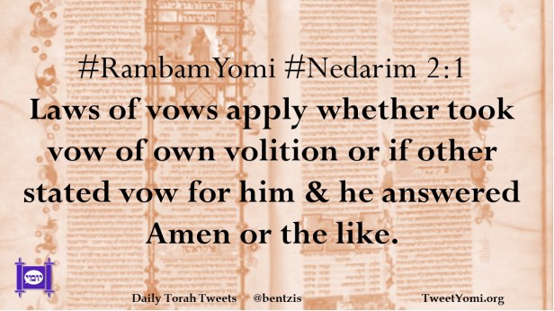 #RambamYomi #Nedarim 2:1 Laws of vows apply whether took vow of own volition or if other stated vow for him & he answered Amen or the like.