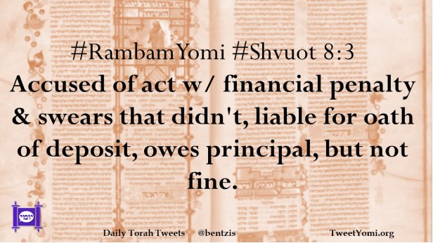 #RambamYomi #Shvuot 8:3 Accused of act w/ financial penalty & swears that didn’t, liable for oath of deposit, owes principal, but not fine.