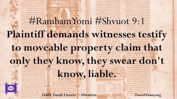#RambamYomi #Shvuot 9:1 Plaintiff demands witnesses testify to moveable property claim that only they know, they swear don’t know, liable.