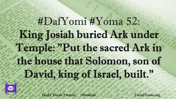DafYomi, Yoma #DafYomi #Yoma 52 Date: August 2, 2021Author: ysspitz #DafYomi #Yoma 52: King Josiah buried Ark under Temple: “Put the sacred Ark in the house that Solomon, son of David, king of Israel, built.” Share this: Share on X (Opens in new window) X Share on Facebook (Opens in new window) Facebook Like Loading... Related