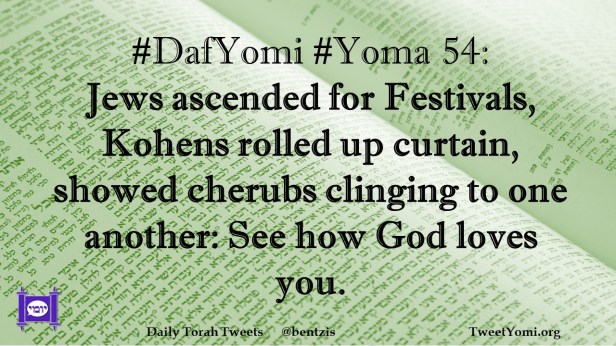 DafYomi, Yoma #DafYomi #Yoma 54 Date: August 2, 2021Author: ysspitz #DafYomi #Yoma 54: Jews ascended for Festivals, Kohens rolled up curtain, showed cherubs clinging to one another: See how God loves you. Share this: Share on X (Opens in new window) X Share on Facebook (Opens in new window) Facebook Like Loading... Related
