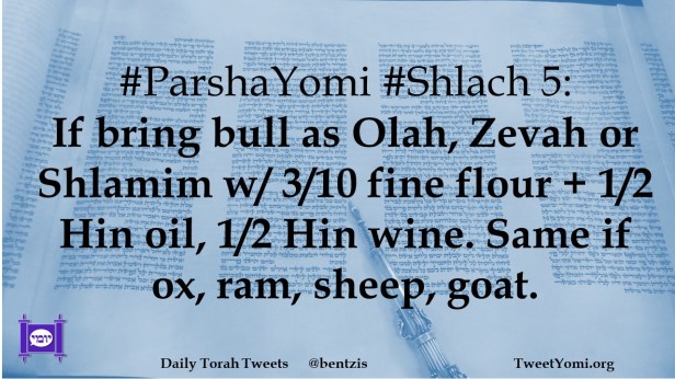 #ParshaYomi #Shlach 5: If bring bull as Olah, Zevah or Shlamim w/ 3/10 fine flour + 1/2 Hin oil, 1/2 Hin wine. Same if ox, ram, sheep, goat.