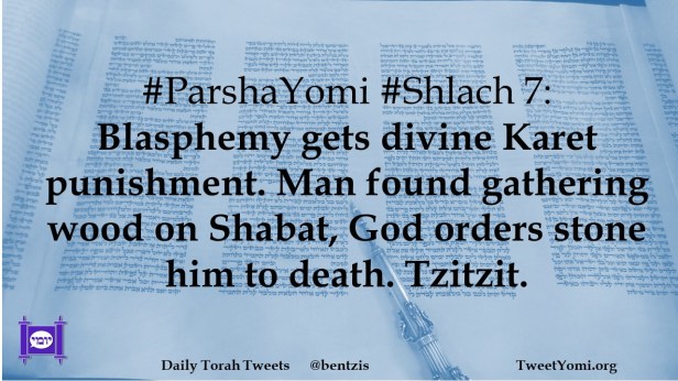#ParshaYomi #Shlach 7: Blasphemy gets divine Karet punishment. Man found gathering wood on Shabat, God orders stone him to death. Tzitzit.