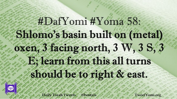 DafYomi, Yoma #DafYomi #Yoma 58 Date: August 4, 2021Author: ysspitz #DafYomi #Yoma 58: Shlomo’s basin built on (metal) oxen, 3 facing north, 3 W, 3 S, 3 E; learn from this all turns should be to right & east. Share this: Share on X (Opens in new window) X Share on Facebook (Opens in new window) Facebook Like Loading... Related