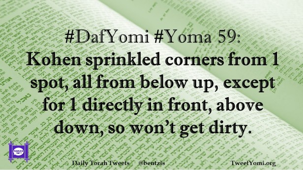 DafYomi, Yoma #DafYomi #Yoma 59 Date: August 4, 2021Author: ysspitz #DafYomi #Yoma 59: Kohen sprinkled corners from 1 spot, all from below up, except for 1 directly in front, above down, so won’t get dirty. Share this: Share on X (Opens in new window) X Share on Facebook (Opens in new window) Facebook Like Loading... Related