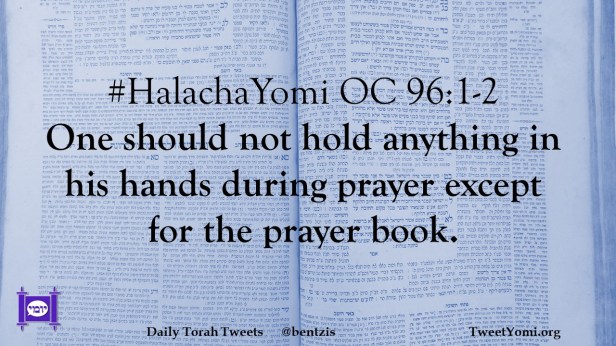 HalachaYomi #HalachaYomi OC 96:1-2 Date: August 4, 2021Author: ysspitz #HalachaYomi OC 96:1-2 One should not hold anything in his hands during prayer except for the prayer book. Share this: Share on X (Opens in new window) X Share on Facebook (Opens in new window) Facebook Like Loading... Related