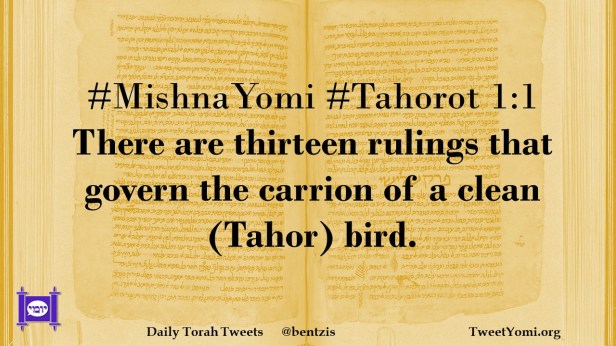 MishnaYomi, Tahorot #MishnaYomi #Tahorot 1:1 Date: August 4, 2021Author: ysspitz #MishnaYomi #Tahorot 1:1 There are thirteen rulings that govern the carrion of a clean (Tahor) bird. Share this: Share on X (Opens in new window) X Share on Facebook (Opens in new window) Facebook Like Loading... Related